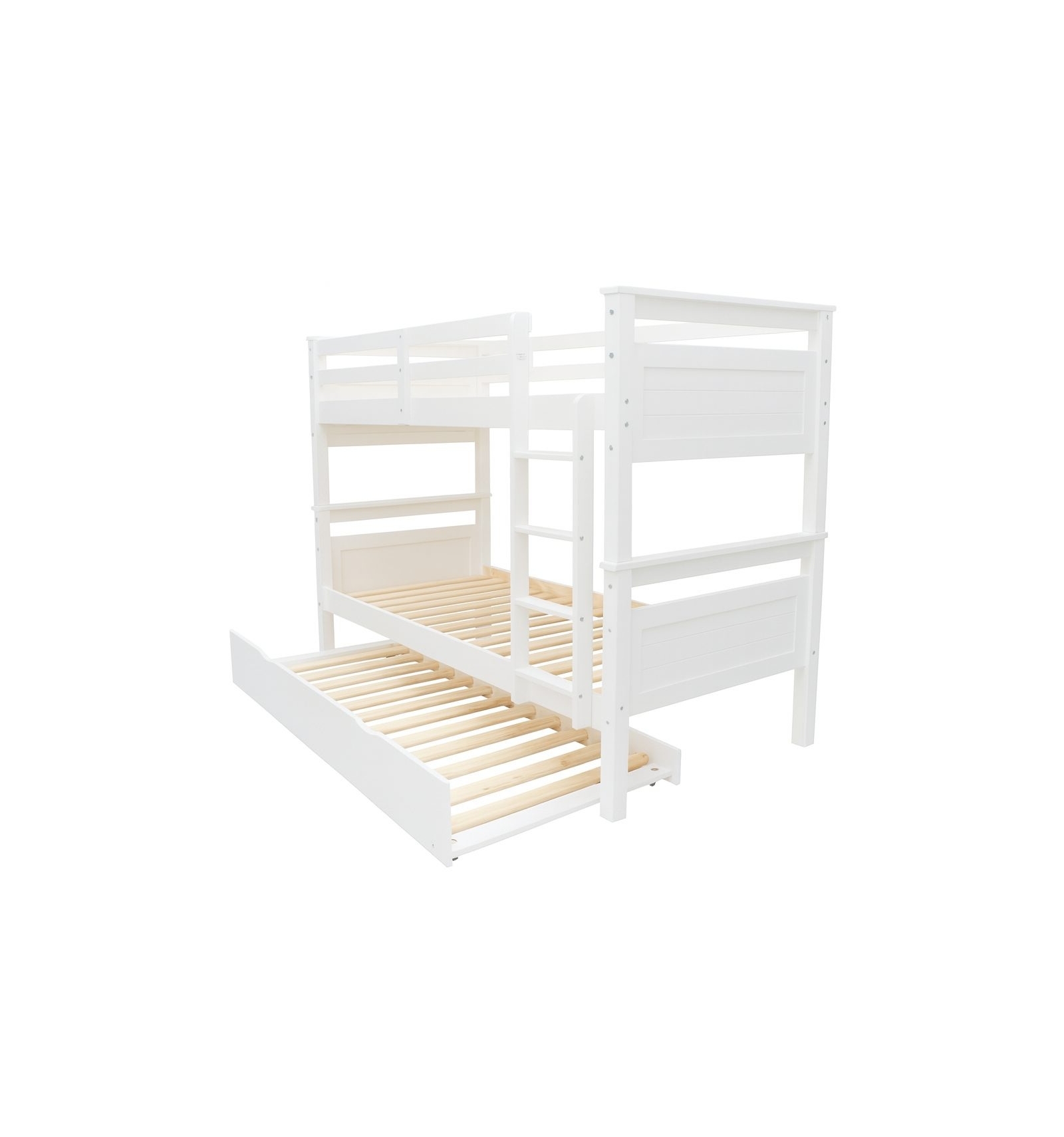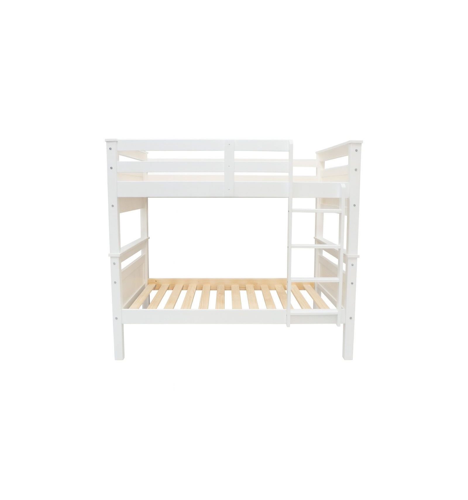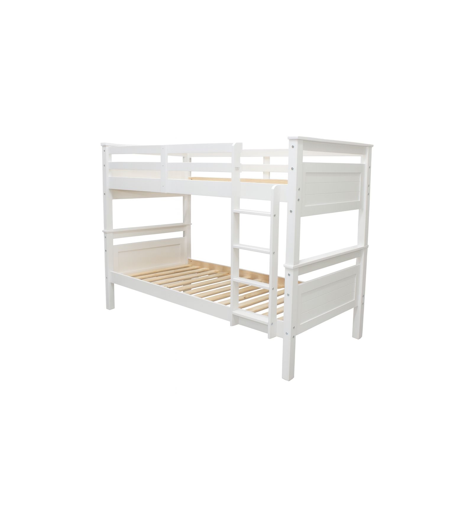 The Titan Vicawu Wooden Bunk Bed is made of solid pine wood with a white finish, offering a sturdy and elegant solution for bedrooms where maximizing space is essential.