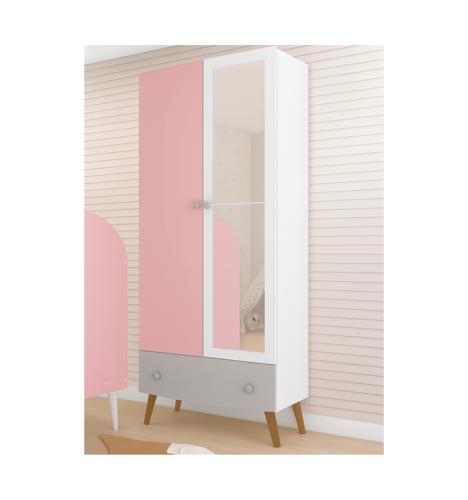 A CHILD'S WARDROBE WITH A LOVELY DESIGN IN A GREY, WHITE AND PINK COMBINATION THAT WILL BRING STYLE AND SAFETY
